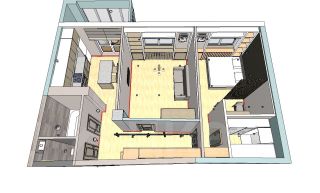 Пол в один уровень, без порогов, с плавным цветовым переходом керамогранит / ламинат. Двери невидимки оптически увеличивающие пространство
