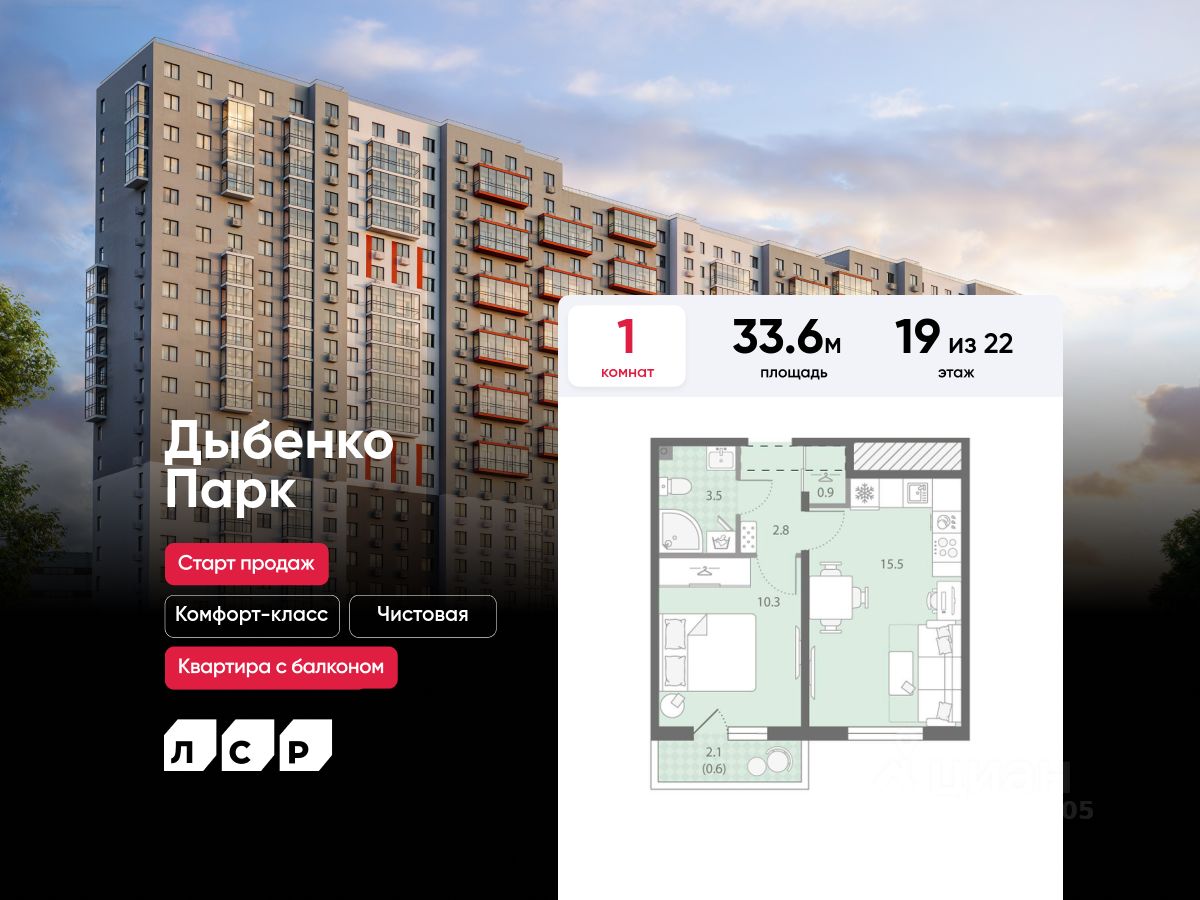 Продается 1-комнатная квартира в ЖК "Дыбенко Парк" на 19 этаже. Общая площадь составляет 33.60 кв. м. Квартира с чистовой отделкой. Жилой комплекс располагается по адресу Санкт-Петербург, проспект Товарищеский.