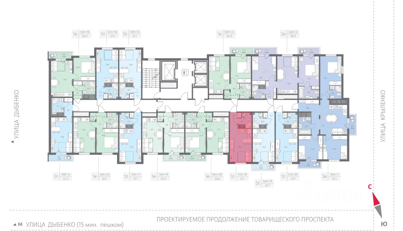Продается студия в ЖК "Дыбенко Парк" на 21 этаже. Общая площадь составляет 21.10 кв. м. Квартира с чистовой отделкой. Жилой комплекс располагается по адресу Санкт-Петербург, проспект Товарищеский.
