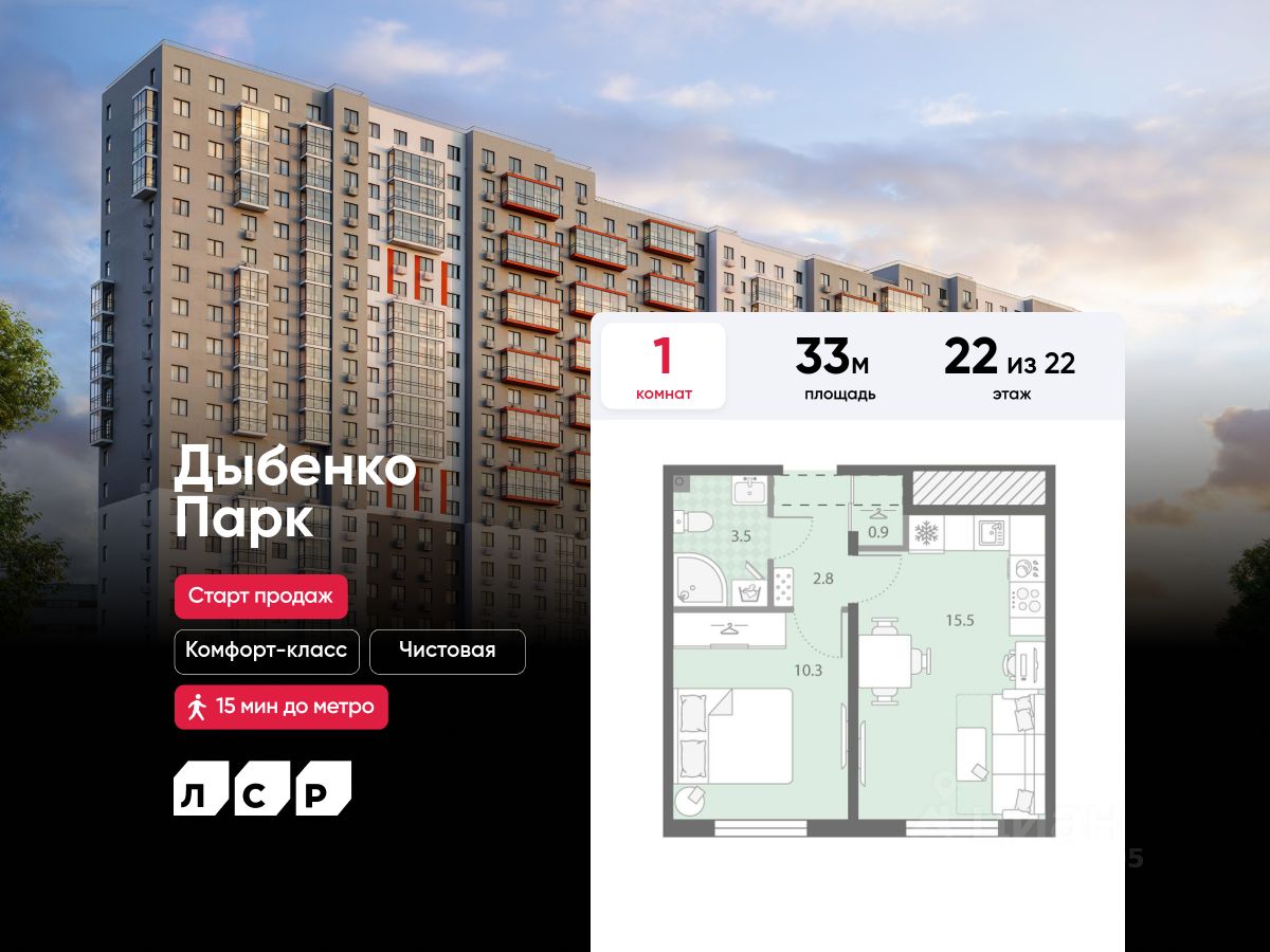 Продается 1-комнатная квартира в ЖК "Дыбенко Парк" на 22 этаже. Общая площадь составляет 33.00 кв. м. Квартира с чистовой отделкой. Жилой комплекс располагается по адресу Санкт-Петербург, проспект Товарищеский.