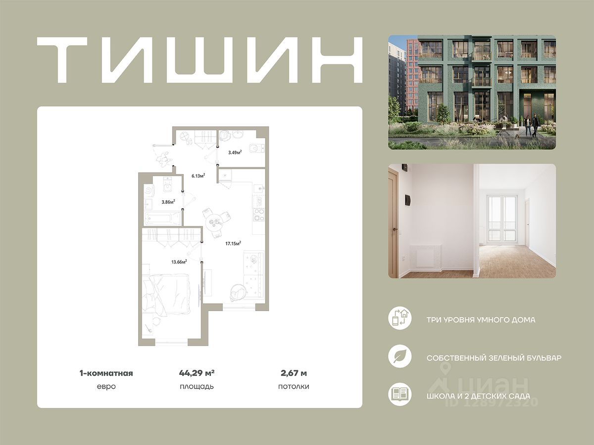 Продаётся 1-комнатная квартира 022, общей площадью 44.29 кв.м., на 3 этаже. Дом комфорт-класса, 12 этажей, в окружении леса и малоэтажной застройки. Проект с умным домом.