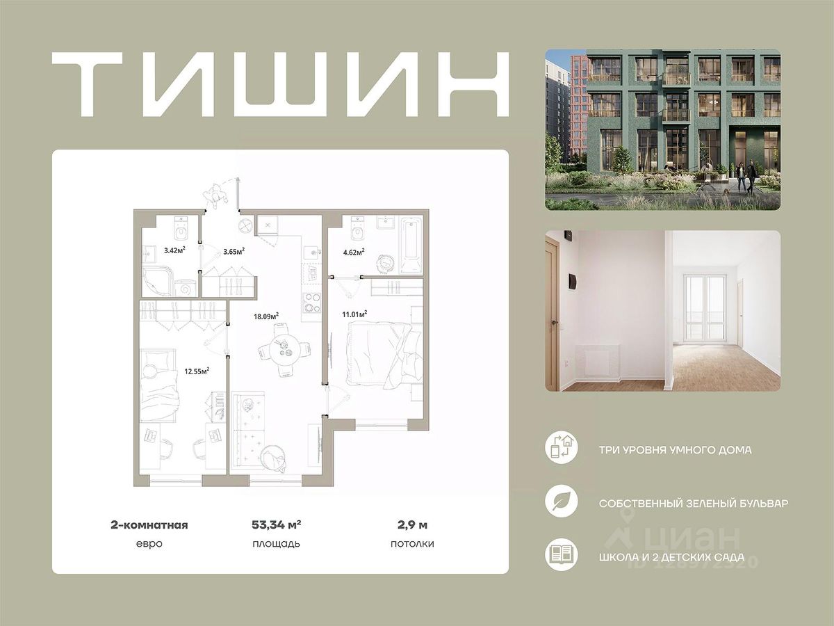 Продаётся 2-комнатная квартира 129, общей площадью 53.34 кв.м., на 4 этаже. Дом комфорт-класса, 12 этажей, в окружении леса и малоэтажной застройки. Проект с умным домом.