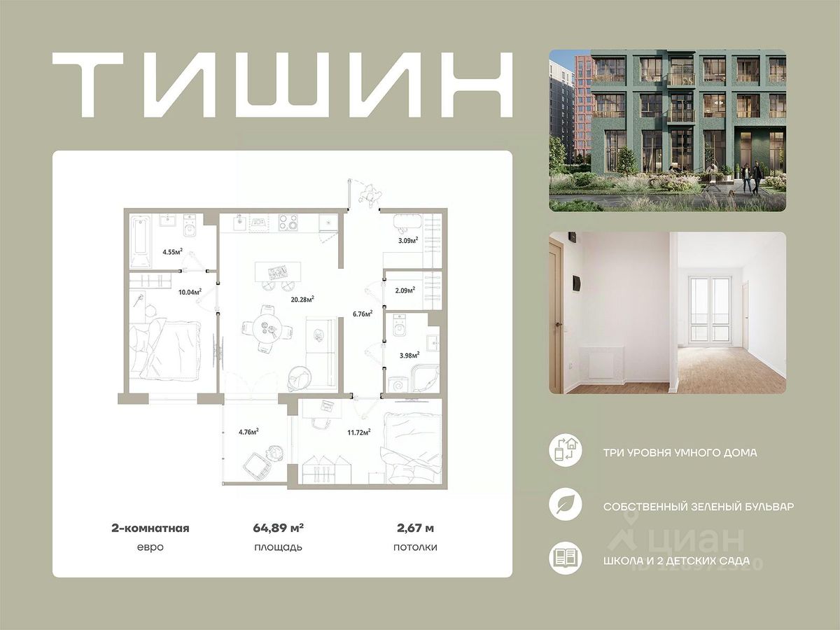 Продаётся 2-комнатная квартира 164, общей площадью 64.89 кв.м., на 4 этаже. Дом комфорт-класса, 12 этажей, в окружении леса и малоэтажной застройки. Проект с умным домом.