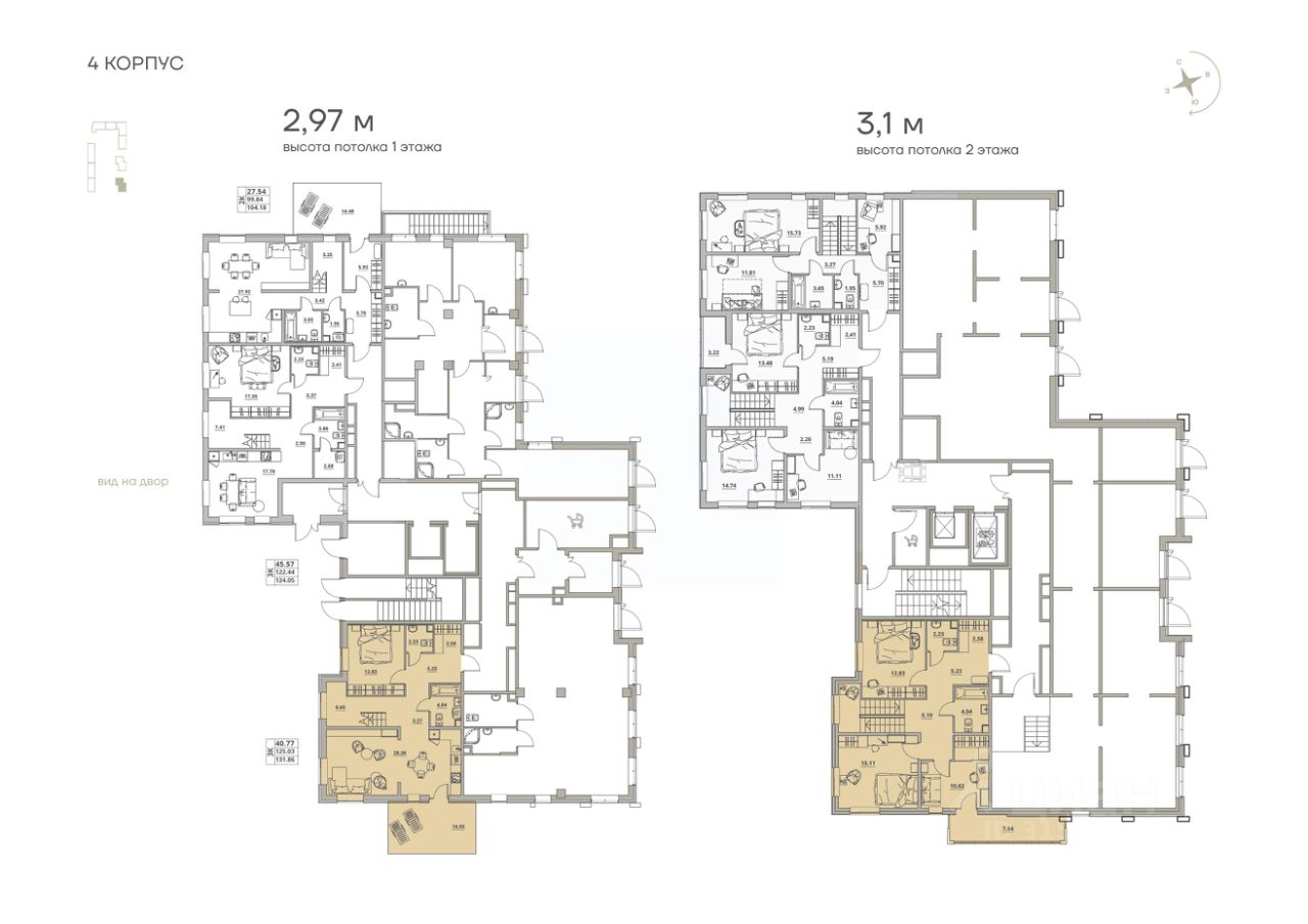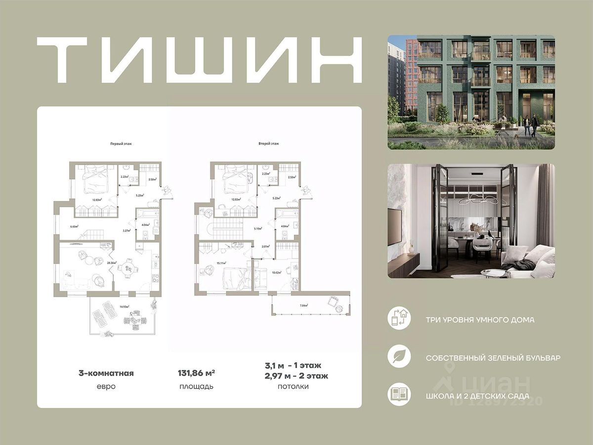 а нестандартные высоты потолков (2,97 м и 3,1 м) подчеркивают статусность этого редкого предложения: первый уровень — светлая гостиная с выходом на террасу, второй — приватные спальни и кабинет.