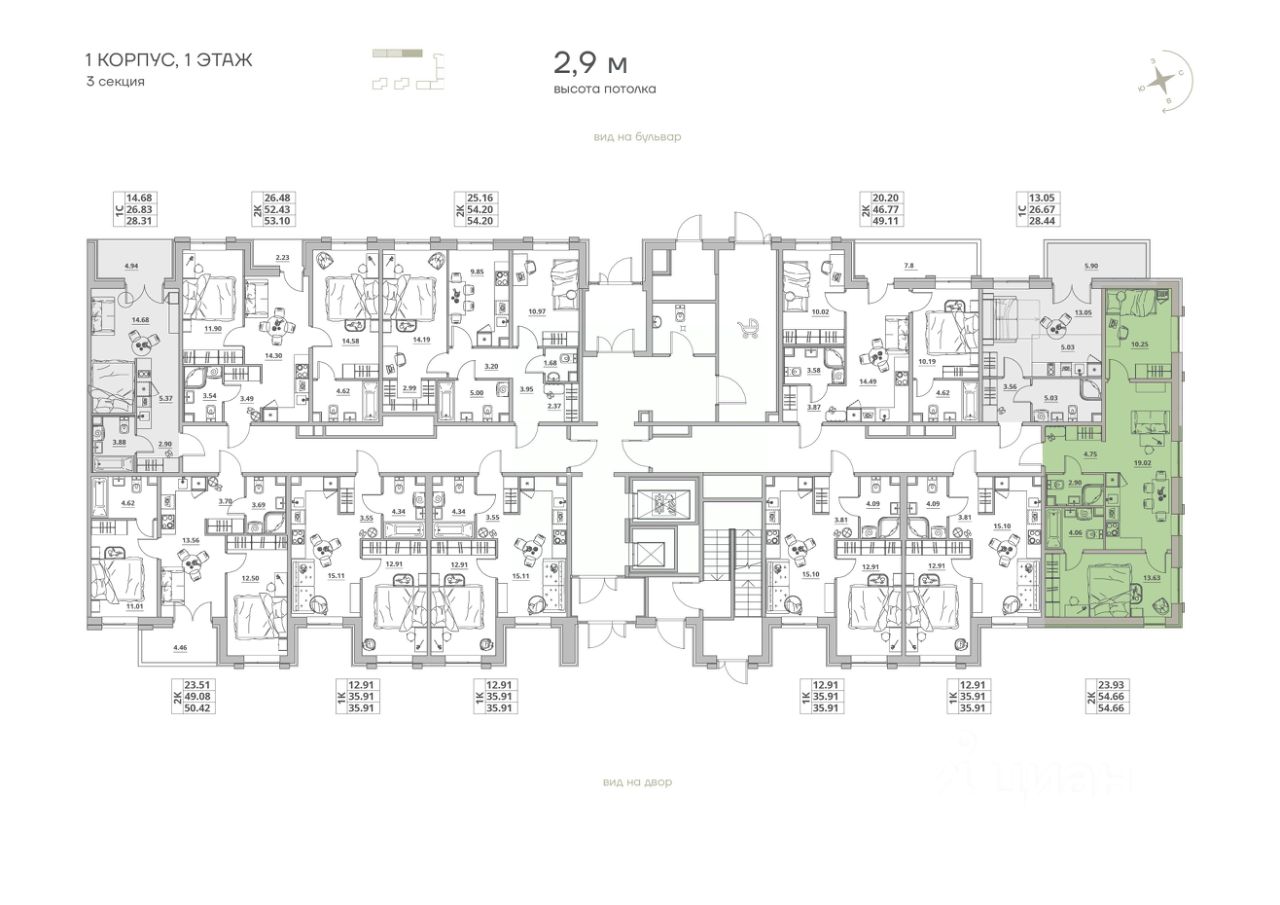 Продаётся 2-комнатная квартира 211, общей площадью 54.66 кв.м., на 1 этаже. Дом комфорт-класса, 12 этажей, в окружении леса и малоэтажной застройки. Проект с умным домом.