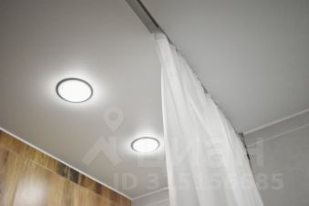 Натяжные потолки, скрытые карнизы в комнате и санузле.