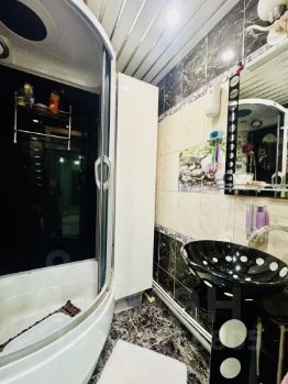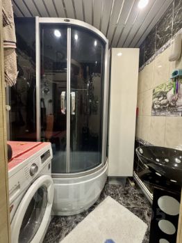 Санузел в кафеле, душевая кабина, красивая оригинальная раковина, стиральная машина нашла себе удобное место в ванной комнате.