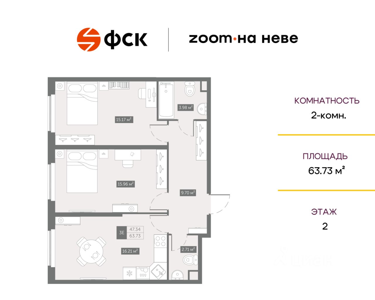 Цена со скидкой до 30% в прямой продаже от застройщика — только в этом месяце. На апартаменты действует беспроцентная рассрочка. Роскошные виды на Неву. 2-к апартамент в комплексе класса бизнес-лайт Зум на Неве на 2-м этаже. Общая площадь 62,7. Чистовая отделка.