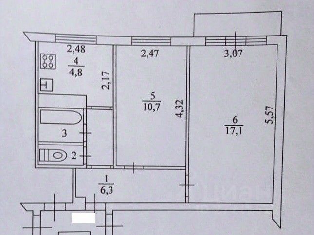 общая площадь 42,6 кв.м., жилая площадь 27,8 кв.м. (комнаты раздельные 17,1/10,7 кв.м.), кухня 4,8 кв.м., прихожая 6,3 кв.м., с/у раздельный, есть балкон, потолки 2,6 м., горячая/холодная вода (без газовой колонки).