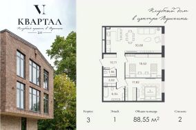 Уютная квартира площадью 88,55 кв.м. Просторный холл, кухня-гостиная 30,88 кв.м. , детская комната и спальня с панорамным окном шириной 3,3 м, и собственной гардеробной. Две ванные комнаты, постирочная, потолки 3м, возможность приобрести машиноместо в подземном паркинге.