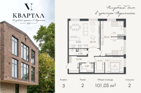 В продаже квартира 101,05 кв.м, расположенная на 2 этаже 3 этажного корпуса. Планировкой предусмотрены кухня-гостиная площадью 22,73 кв.м и кухня 9,0 кв.м., просторная детская для двух детей, спальня площадью 17,77 кв.м с собственной гардеробной. В холле место для системы хранения, гостевой с/у, постирочная. Высота потолка 3м, панорамные окна.