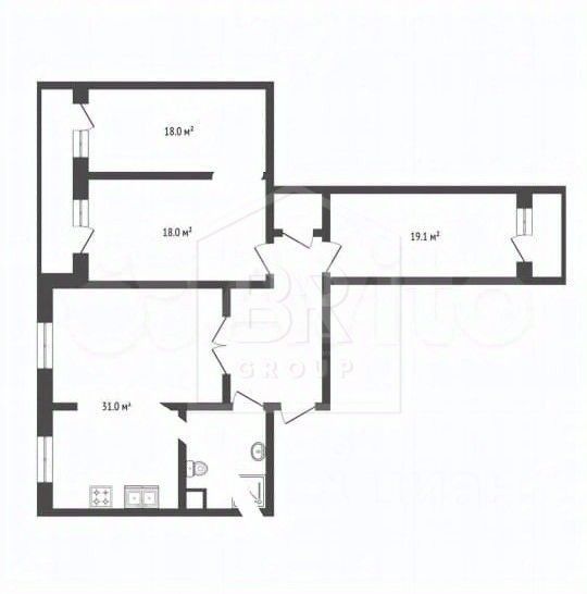 Комнаты: 19,1 18 18 м. Кв.