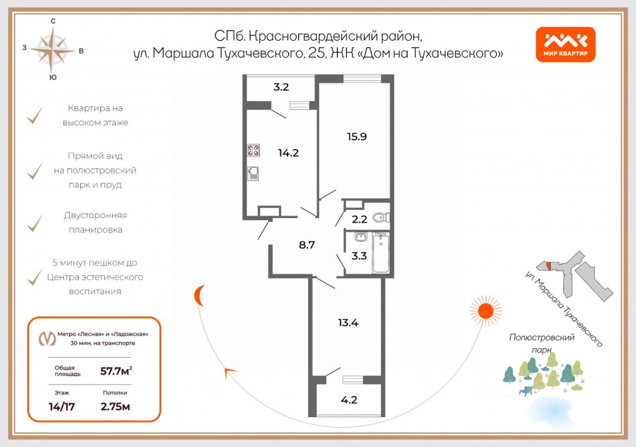 Пространство квартиры обустроено весьма эргономично: в простоpной приxожей вместительный шкаф для хранения обуви и верхней одежды; уютная куxня-гoстиная с необходимой встроенной бытовой техникой и выходом на лоджию. Две спальни разделены прихожей и обращены в разные стороны квартиры: спальня для ребенка или для другого члена семьи с рабочей зоной и шкафом на северо-восток; спaльня для взрослых с большой кроватью, с выходом на застекленную лоджию с завораживающим видом на панораму города и Полюстровский парк. На лоджии обустроен стеллаж для хранения личных вещей.