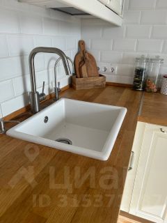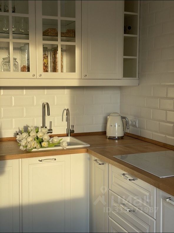 - Кухня: встроенная посудомоечная машина, светлые фасады гарнитура, деревянные столешницы. Фартук из белой плитки в формате "метро" придаёт современный вид, а подвесные светильники с прозрачными плафонами создают мягкое освещение.