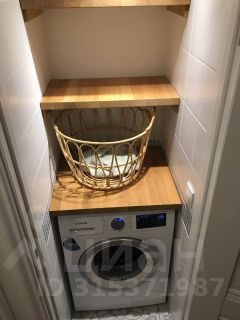 - Хозяйственная зона: компактная прачечная с плиточным полом и деревянными полками для хранения.