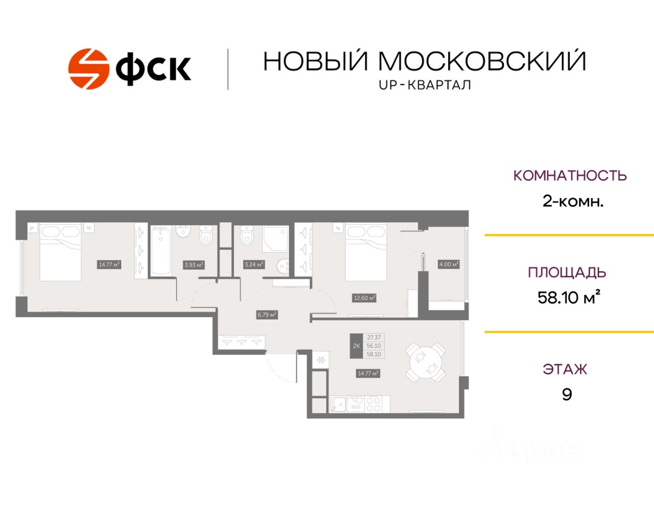Цена со скидкой до 30% в прямой продаже от застройщика — только в этом месяце. Беспроцентная рассрочка. 2-к квартира в ЖК Up-квартал "Новый Московский" на 9-м этаже. Общая площадь 58,1. Чистовая отделка.