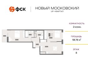 Цена со скидкой до 30% в прямой продаже от застройщика — только в этом месяце. Беспроцентная рассрочка. 2-к квартира в ЖК Up-квартал "Новый Московский" на 8-м этаже. Общая площадь 58,78. Без отделки.
