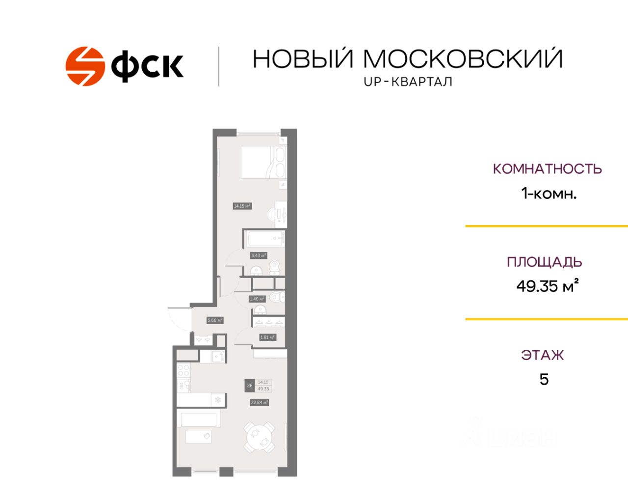 Цена со скидкой до 30% в прямой продаже от застройщика — только в этом месяце. Беспроцентная рассрочка. 1-к квартира в ЖК Up-квартал "Новый Московский" на 5-м этаже. Общая площадь 49,35. Без отделки.