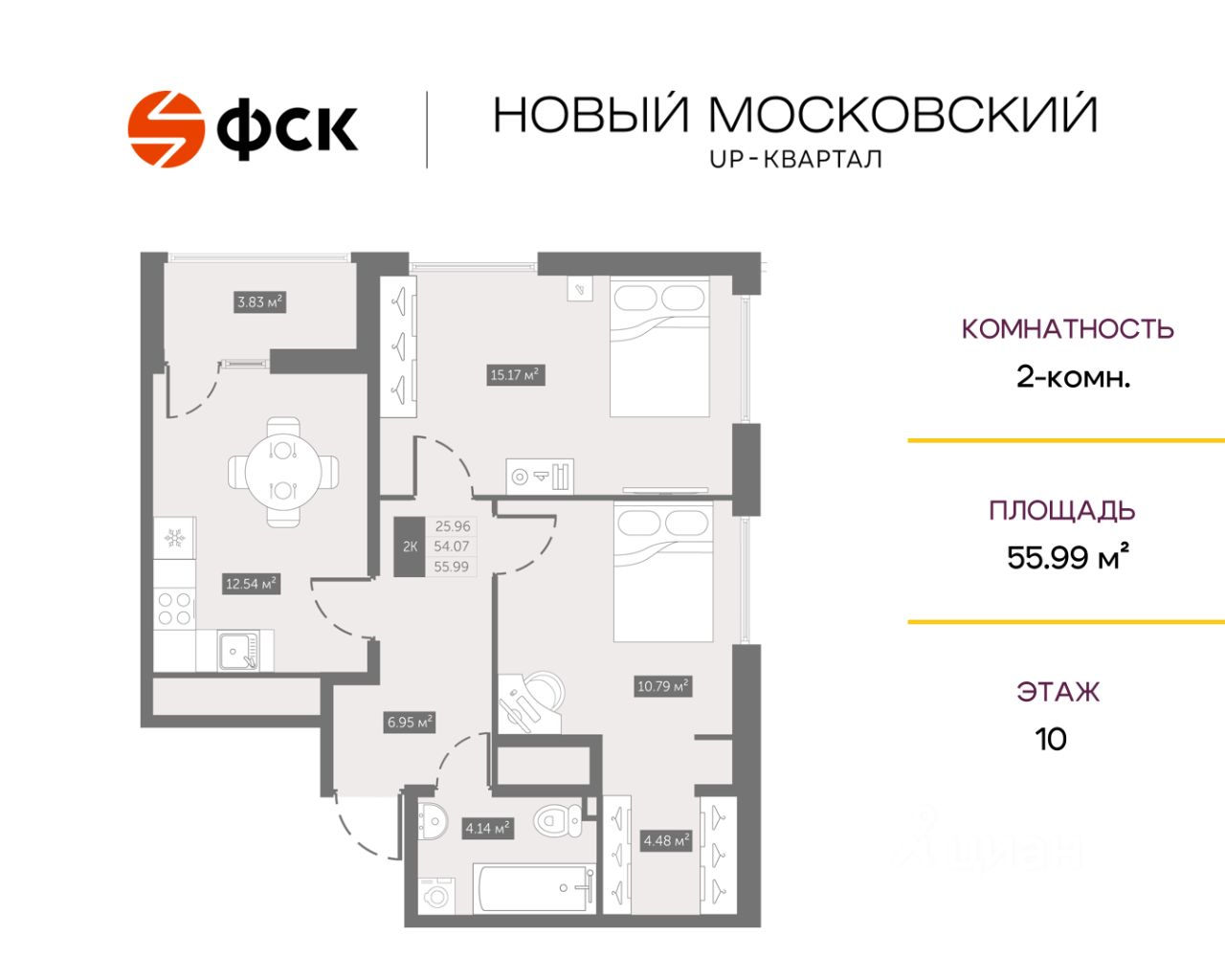 Цена со скидкой до 30% в прямой продаже от застройщика — только в этом месяце. Беспроцентная рассрочка. 2-к квартира в ЖК Up-квартал "Новый Московский" на 10-м этаже. Общая площадь 55,99. Без отделки.