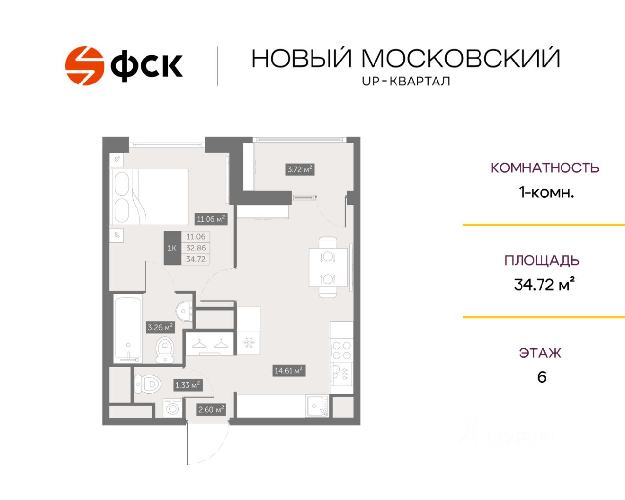 Цена со скидкой до 30% в прямой продаже от застройщика — только в этом месяце. Беспроцентная рассрочка. 1-к квартира в ЖК Up-квартал "Новый Московский" на 6-м этаже. Общая площадь 34,72. Без отделки.