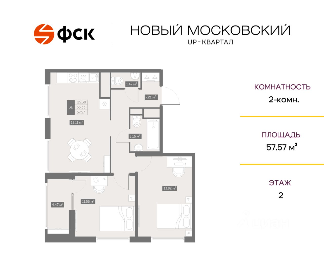 Цена со скидкой до 30% в прямой продаже от застройщика — только в этом месяце. Беспроцентная рассрочка. 2-к квартира в ЖК Up-квартал "Новый Московский" на 2-м этаже. Общая площадь 57,57. Чистовая отделка.