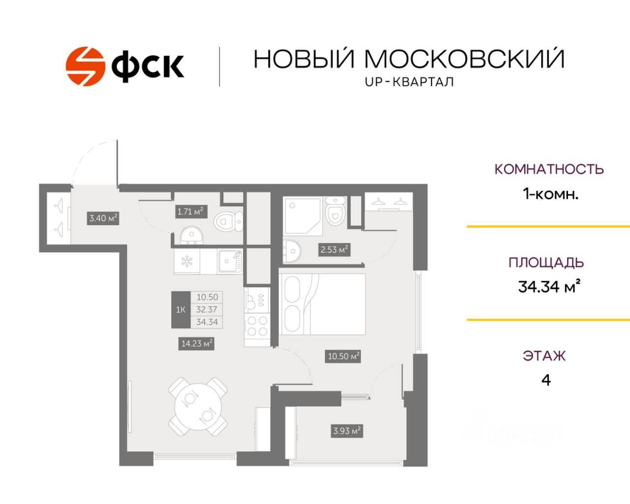 Цена со скидкой до 30% в прямой продаже от застройщика — только в этом месяце. Беспроцентная рассрочка. 1-к квартира в ЖК Up-квартал "Новый Московский" на 4-м этаже. Общая площадь 34,34. Без отделки.