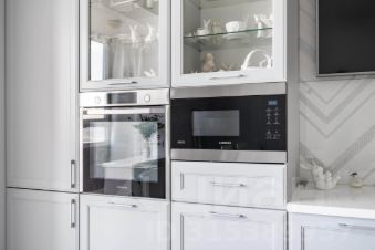 Кухня оснащена всем необходимым , вся техника встроена : холодильник , посудомоечная машина , микроволновая печь , стиральная машина.