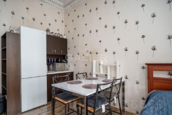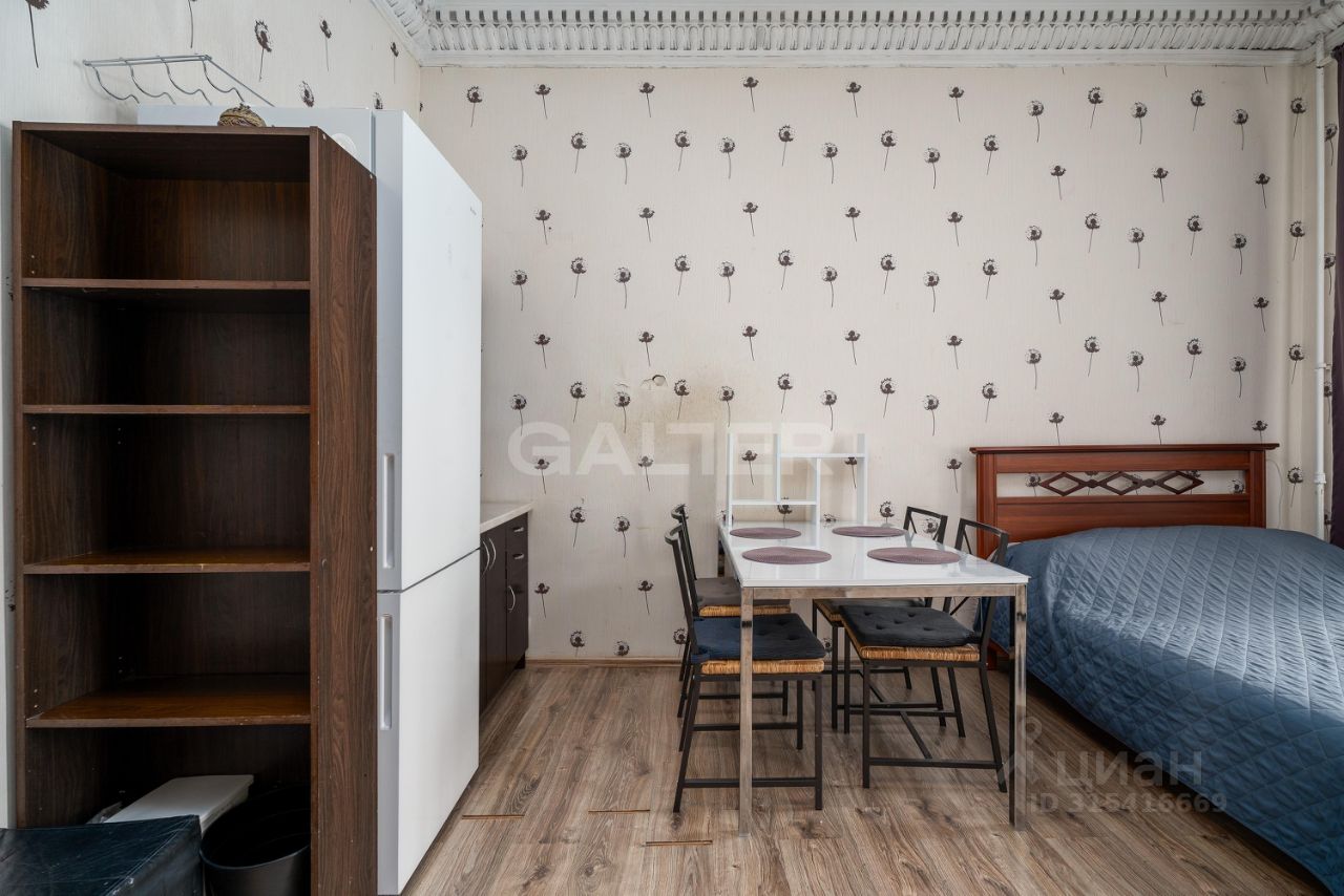 - Комната разделена на 2 временной перегородкой с дверным проемом. 2 спальных места и зона столовой, организованы места для хранения.