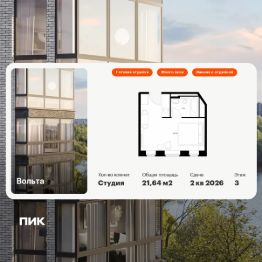 Продаются апартаменты-студия площадью 21,64 кв.м на 3 этаже 15 этажного дома (Вольта, Секция 1) проекта ПИК Вольта.