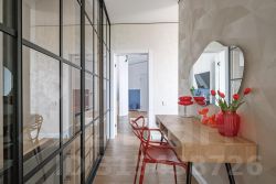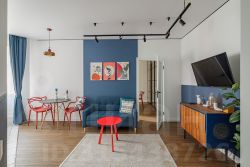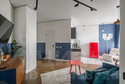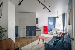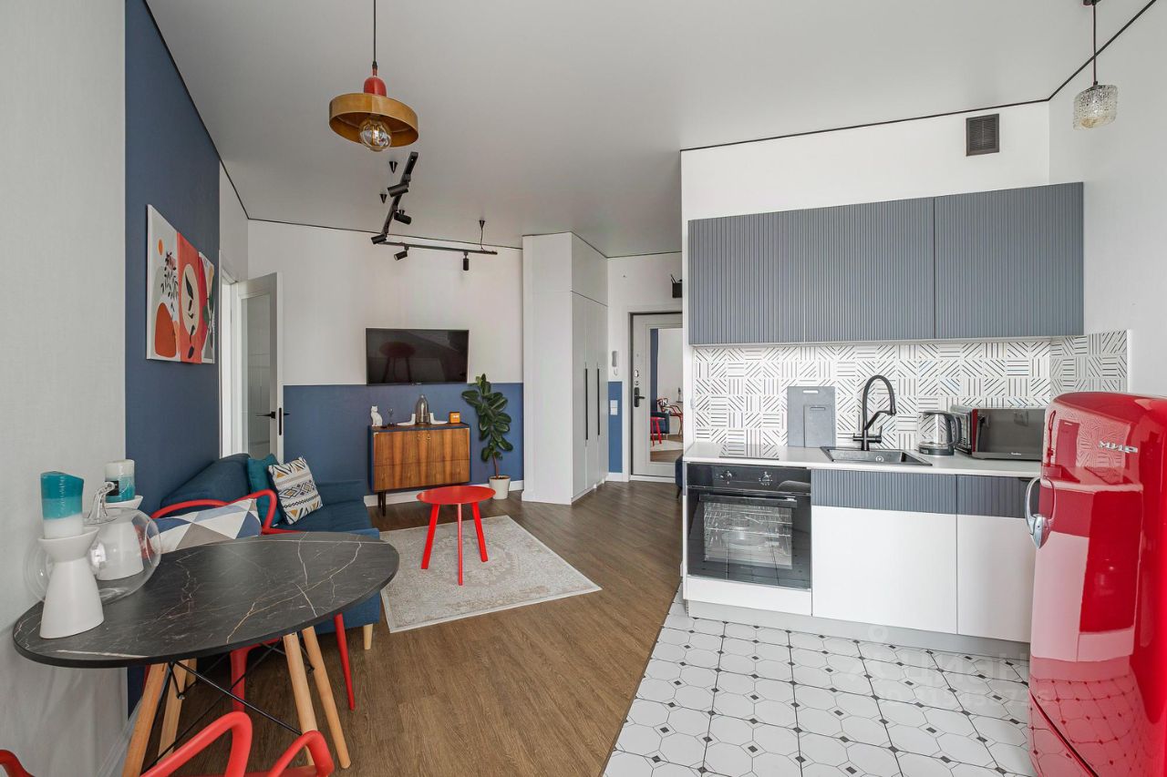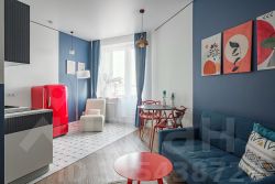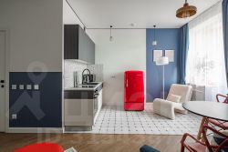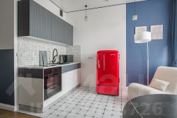 Прихожая, гостиная и кухня сливаются в одном пространстве, что дает ощущение легкости и простора. Зона для приготовления пищи достаточно компактна, но ничто не мешает при необходимости ее расширить и обустроить под себя. Встроенная электрическая варочная панель, духовой шкаф и посудомоечная машина сегодня являются неотъемлемыми атрибутами любой кухни, а винтажный холодильник добавляет колорита современной обстановке.