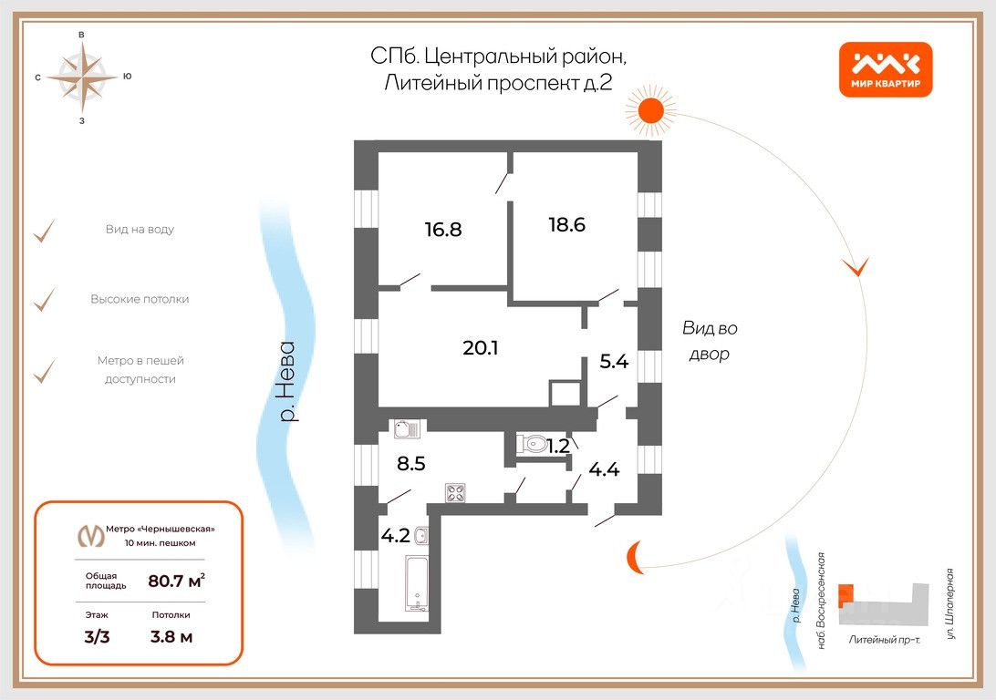В квартире двусторонняя планировка: 4 фасадных окна обращены в сторону Невы, Литейного моста, Авроры, Финляндского вокзала, гостиницы Санкт-Петербург, и 4 окна смотрят в сторону Шпалерной улицы и в закрытый двор. Квартира очень светлая и тихая.