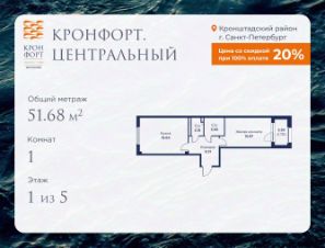 Предлагается квартира площадью 51.68 кв.м в жилом комплексе "Кронфорт. Центральный" в Санкт-Петербурге (Кронштадт). Возможна покупка с использованием льготных и специальных ипотечных программ с государственной поддержкой.