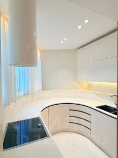 - обустройство кухонного пространства с установкой кухонной мебели МДФ GLUNZ (Германия), изогнутой столешнищы Caesastone из кварца и фартука из акрилового камня Samsung SP011;
