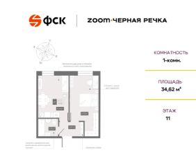 Цена со специальной скидкой в прямой продаже от застройщика — только в этом месяце. 1-к апартамент в комплексе класса бизнес-лайт Zoom Чёрная Речка на 11-м этаже. Общая площадь 34,62. Предчистовая отделка.