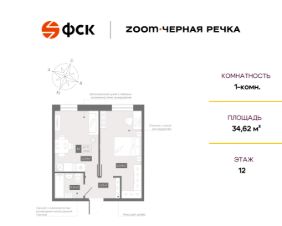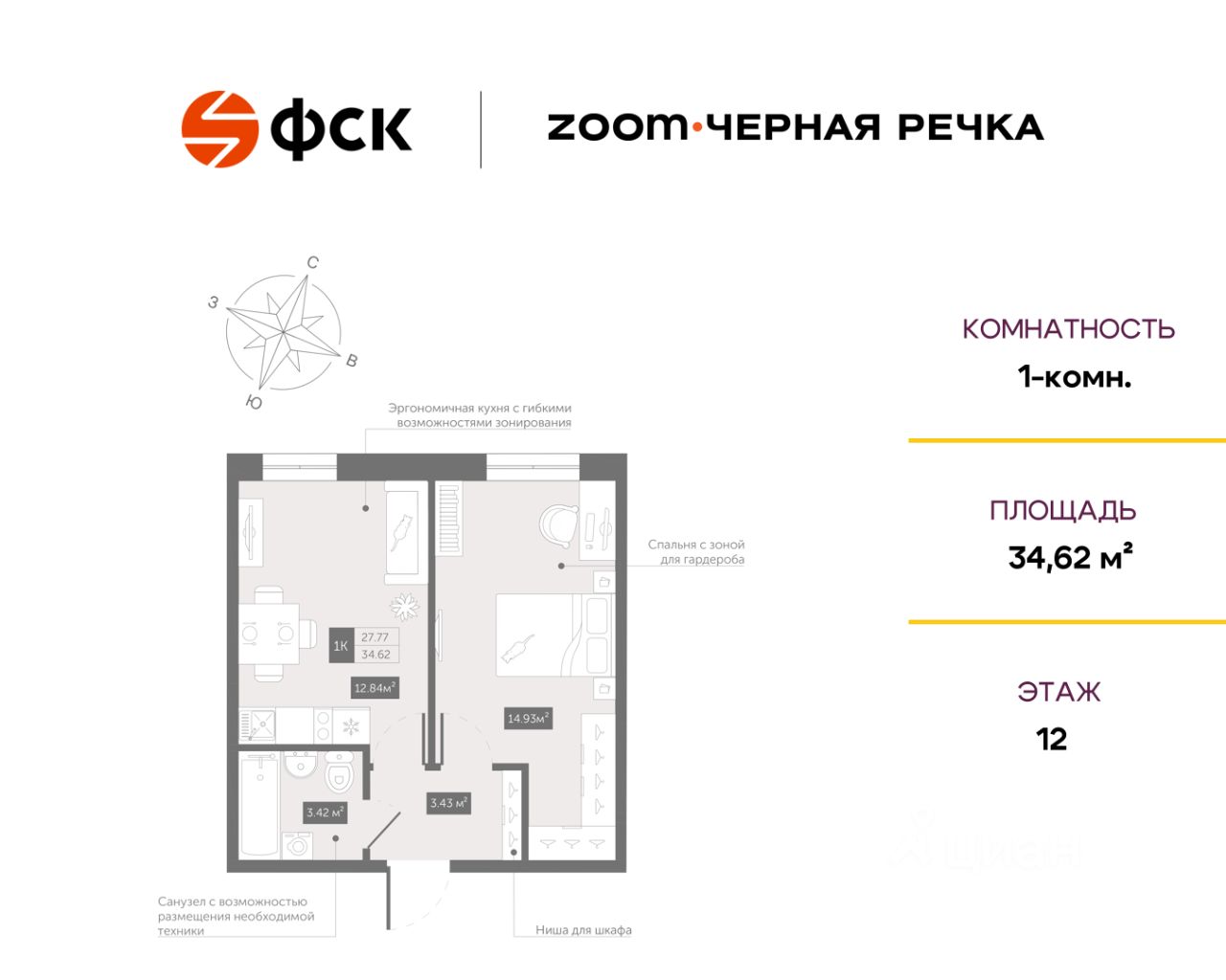 Цена со специальной скидкой в прямой продаже от застройщика — только в этом месяце. 1-к апартамент в комплексе класса бизнес-лайт Zoom Чёрная Речка на 12-м этаже. Общая площадь 34,62. Предчистовая отделка.