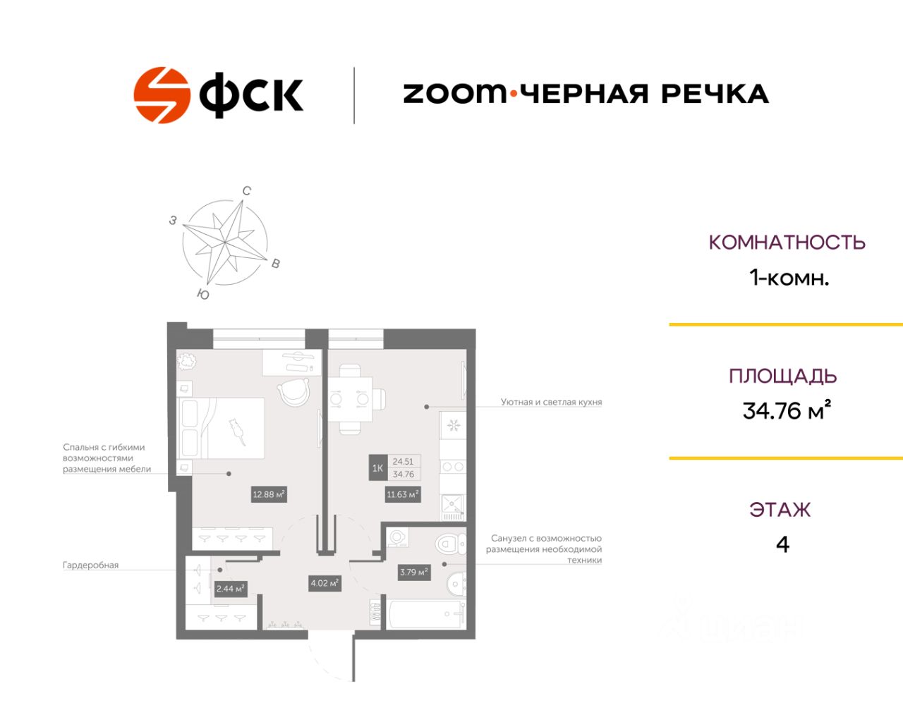 Цена со специальной скидкой в прямой продаже от застройщика — только в этом месяце. 1-к апартамент в комплексе класса бизнес-лайт Zoom Чёрная Речка на 4-м этаже. Общая площадь 34,76. Предчистовая отделка.
