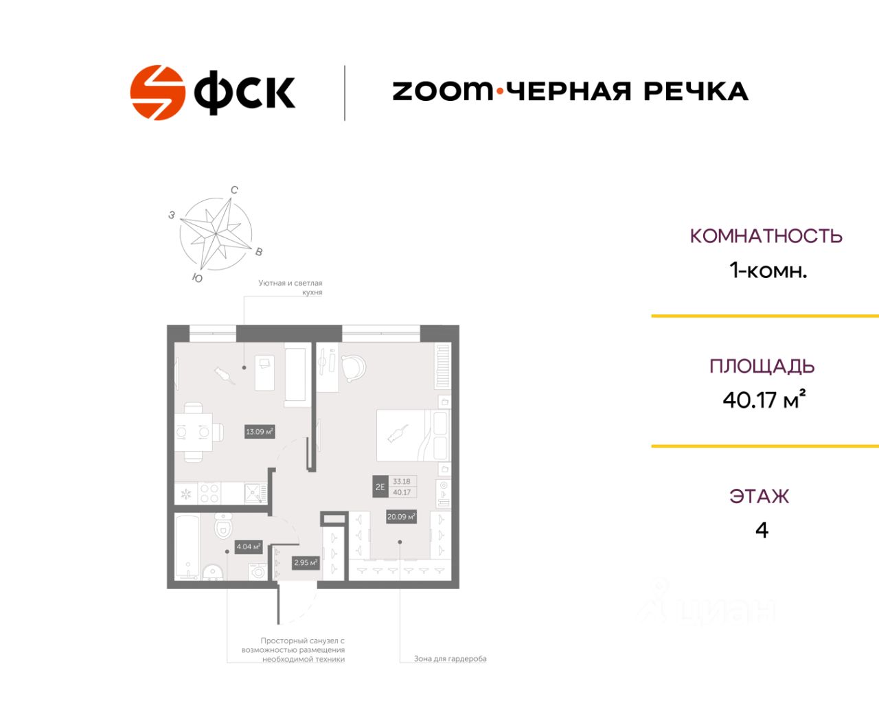 Цена со специальной скидкой в прямой продаже от застройщика — только в этом месяце. 1-к апартамент в комплексе класса бизнес-лайт Zoom Чёрная Речка на 4-м этаже. Общая площадь 40,17. Предчистовая отделка.