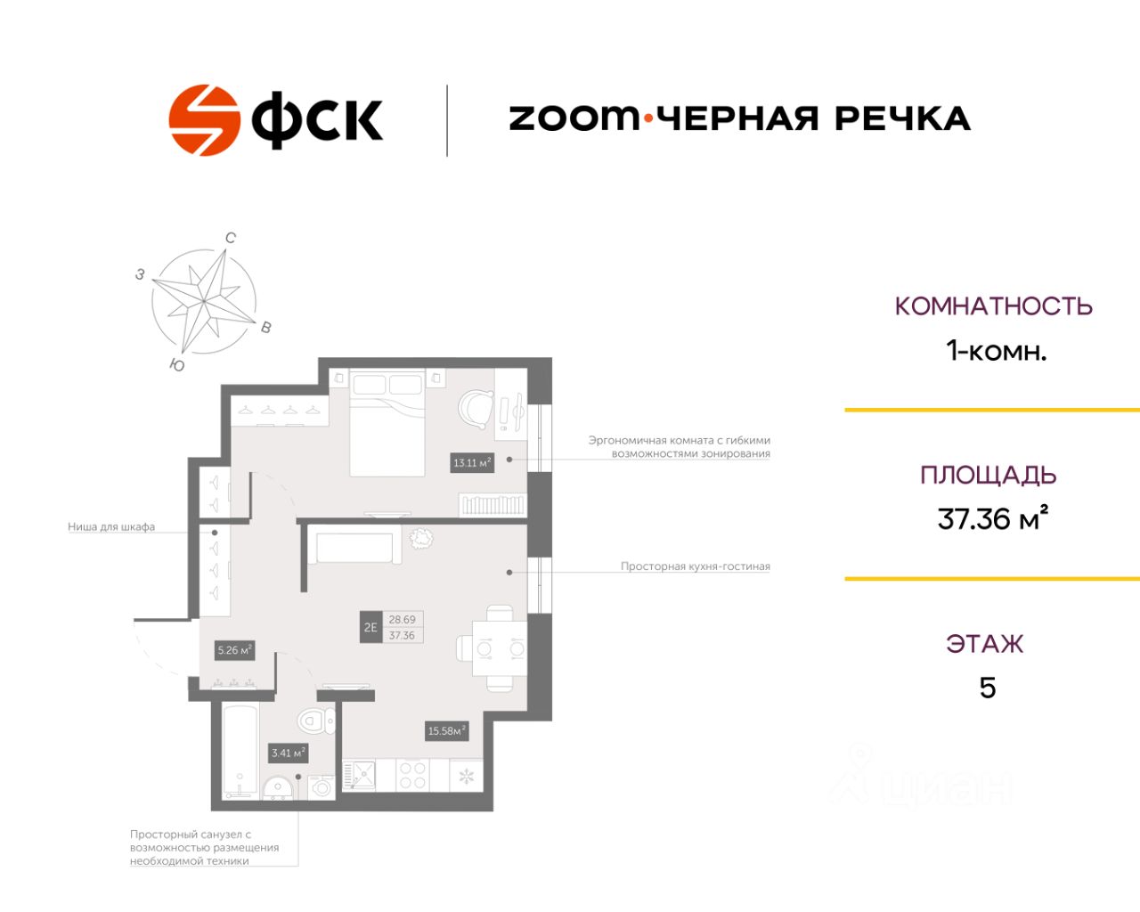 Цена со специальной скидкой в прямой продаже от застройщика — только в этом месяце. 1-к апартамент в комплексе класса бизнес-лайт Zoom Чёрная Речка на 5-м этаже. Общая площадь 37,36. Предчистовая отделка.