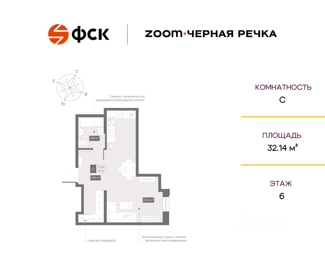 Цена со специальной скидкой в прямой продаже от застройщика — только в этом месяце. Апартамент-студия в комплексе класса бизнес-лайт Zoom Чёрная Речка на 6-м этаже. Общая площадь 32,14. Чистовая отделка.