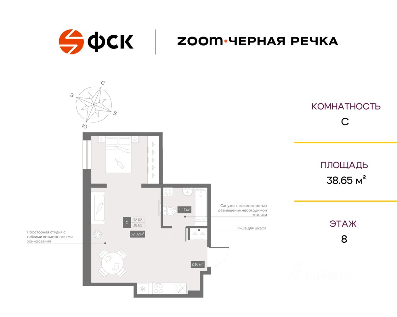 Цена со специальной скидкой в прямой продаже от застройщика — только в этом месяце. Апартамент-студия в комплексе класса бизнес-лайт Zoom Чёрная Речка на 8-м этаже. Общая площадь 38,65. Чистовая отделка.