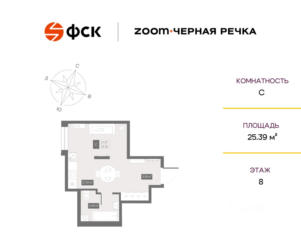 Цена со специальной скидкой в прямой продаже от застройщика — только в этом месяце. Апартамент-студия в комплексе класса бизнес-лайт Zoom Чёрная Речка на 8-м этаже. Общая площадь 25,39. Без отделки.