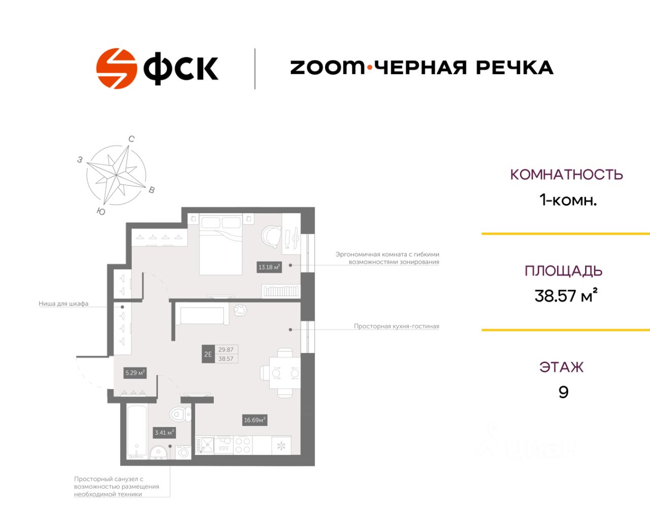 Цена со специальной скидкой в прямой продаже от застройщика — только в этом месяце. 1-к апартамент в комплексе класса бизнес-лайт Zoom Чёрная Речка на 9-м этаже. Общая площадь 38,57. Предчистовая отделка.