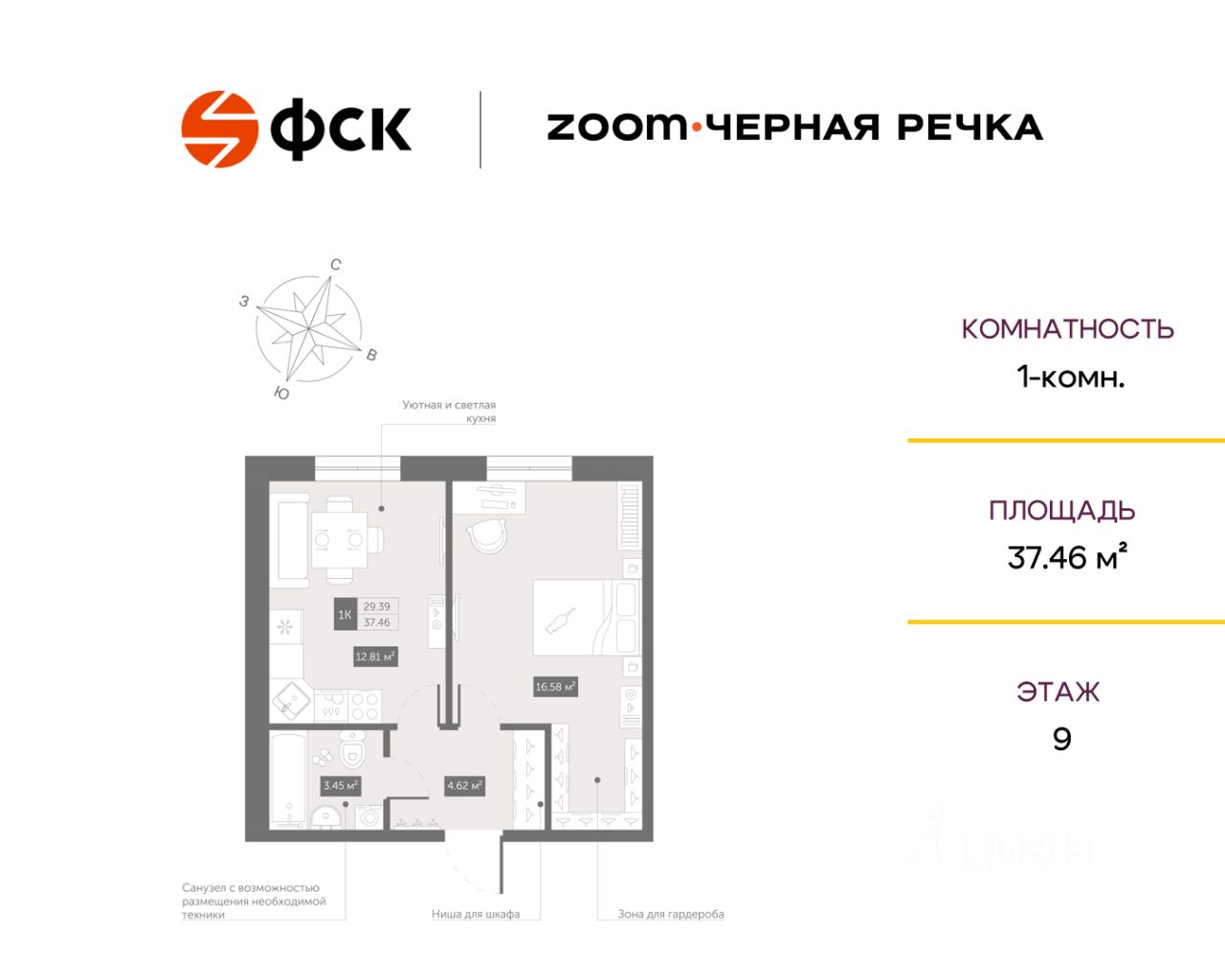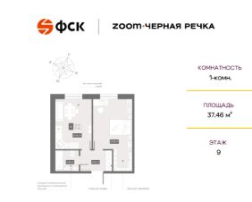 Цена со специальной скидкой в прямой продаже от застройщика — только в этом месяце. 1-к апартамент в комплексе класса бизнес-лайт Zoom Чёрная Речка на 9-м этаже. Общая площадь 37,46. Предчистовая отделка.