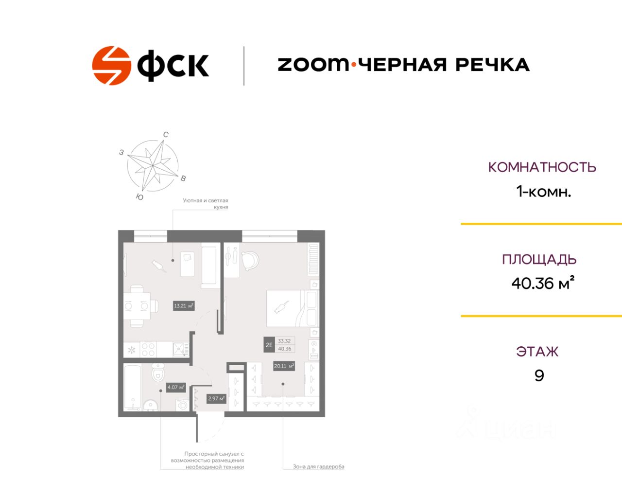 Цена со специальной скидкой в прямой продаже от застройщика — только в этом месяце. 1-к апартамент в комплексе класса бизнес-лайт Zoom Чёрная Речка на 9-м этаже. Общая площадь 40,36. Предчистовая отделка.