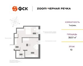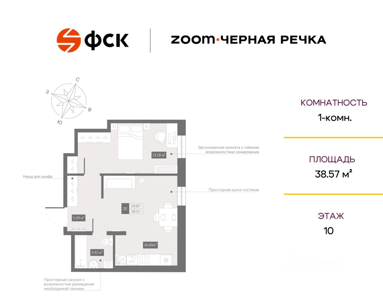 Цена со специальной скидкой в прямой продаже от застройщика — только в этом месяце. 1-к апартамент в комплексе класса бизнес-лайт Zoom Чёрная Речка на 10-м этаже. Общая площадь 38,57. Предчистовая отделка.