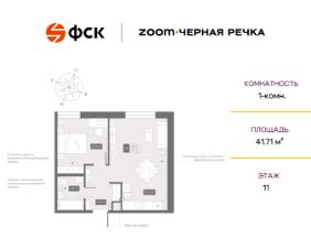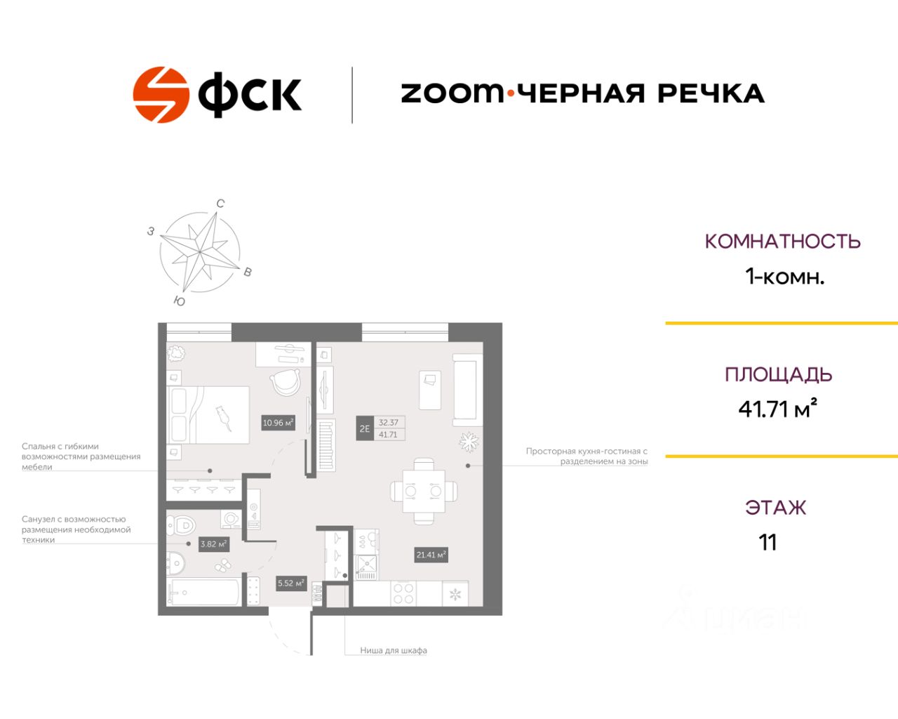 Цена со специальной скидкой в прямой продаже от застройщика — только в этом месяце. 1-к апартамент в комплексе класса бизнес-лайт Zoom Чёрная Речка на 11-м этаже. Общая площадь 41,71. Предчистовая отделка.
