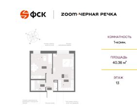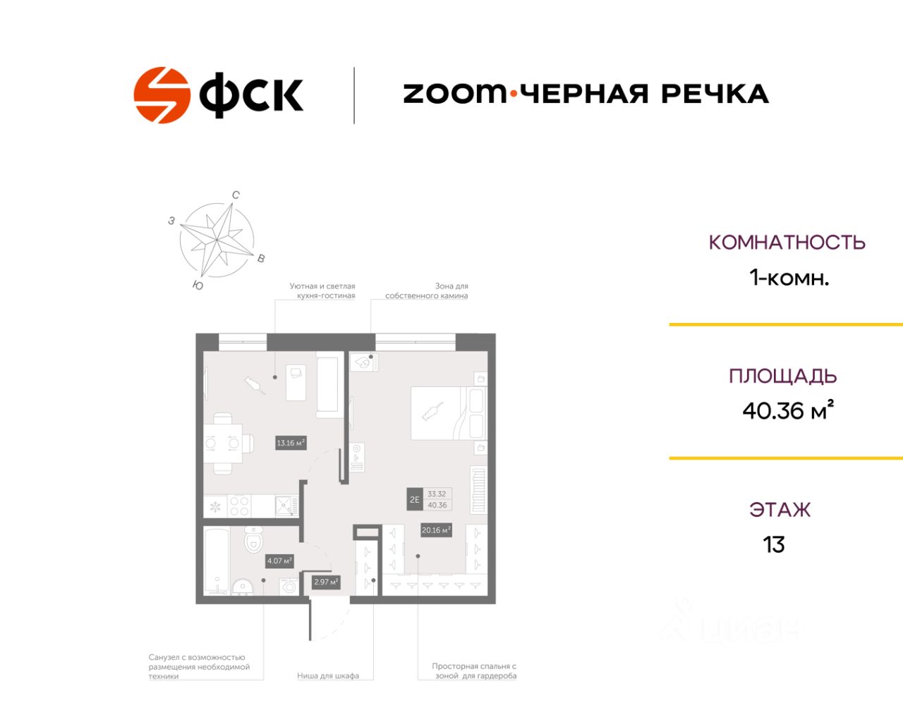 Цена со специальной скидкой в прямой продаже от застройщика — только в этом месяце. 1-к апартамент в комплексе класса бизнес-лайт Zoom Чёрная Речка на 13-м этаже. Общая площадь 40,36. Предчистовая отделка.