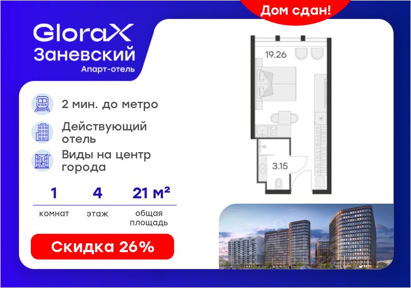 Продается апартамент-студия на 4-м этаже в Апарт-отеле "GloraX Заневский" с сервисом 4*. Старт работы отеля - декабрь 2024 г.! Общая площадь лота составляет 22,41 кв. м, из которых 19,26 кв. м отведено под жилую. Номер апартамента - 420.