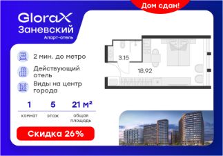 Продается апартамент-студия на 5-м этаже в Апарт-отеле "GloraX Заневский" с сервисом 4*. Старт работы отеля - декабрь 2024 г.! Общая площадь лота составляет 22,07 кв. м, из которых 18,92 кв. м отведено под жилую. Номер апартамента - 533.