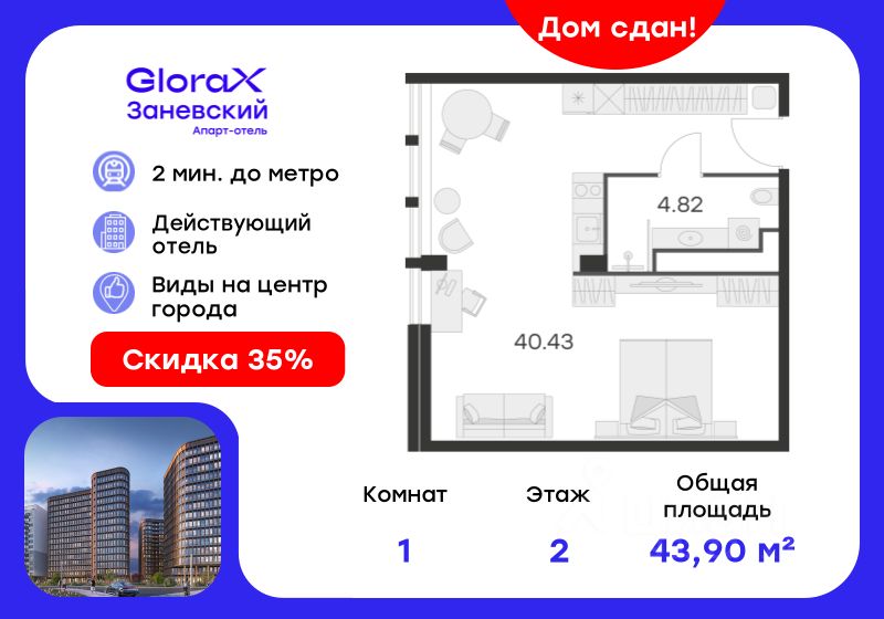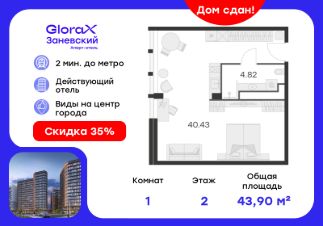 Продается апартамент-студия на 2-м этаже в Апарт-отеле "GloraX Заневский" с сервисом 4*. Старт работы отеля - декабрь 2024 г.! Общая площадь лота составляет 45,25 кв. м, из которых 40,43 кв. м отведено под жилую. Номер апартамента - 221.